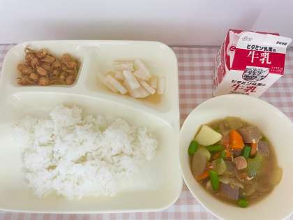じゃこ豆は、ちりめんじゃこ、ごま、揚げた大豆を使用し、砂糖としょうゆで作ったたれをからめた献立で、児童にも人気の一品です♪