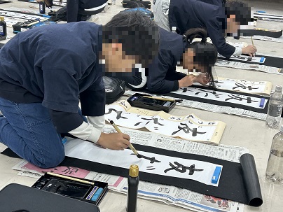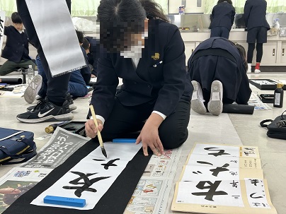 3学期が始まり、子どもたちは学校で書き初めにチャレンジしています。この日、3年生が書き初めに取り組んでいました。長い半紙に「友だち」の字を書きました。止めはね払いに気をつけながら、懸命に取り組んでいました。
