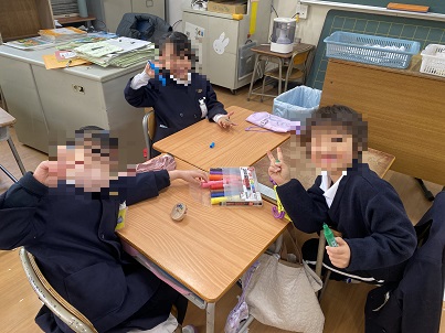 生活科の昔遊びをするため、図画工作科で鉄芯木ゴマにペンで色付け中・・・。