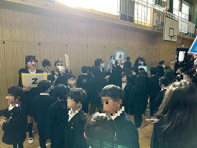 集会委員会から受け取ったプリントに”○○な先生”と指示が書いています。にこにこ班のみんなで協力して、その先生を探します。わかった班は集会委員会に報告に行きます。たくさんの先生に交流できて、子どもたちは楽しそうでした。