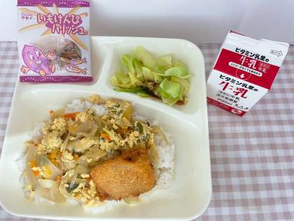 具と一口トンカツをご飯の上にのせて食べる、児童に好評な献立です♪