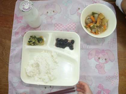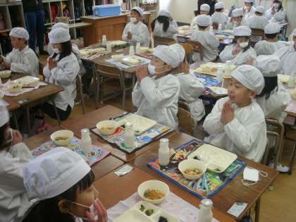 1年2組の「いただきます!」。みんな、なかよく食べます。今日は、とても寒い日ですが、教室の中は気持ちいい暖かさです。