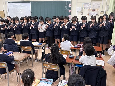 2年生の教室に、4年生がリコーダーを持って入っていきました。