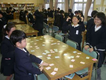 今年度5回目の土曜授業でした。4年生では百人一首を図書室でしました。なかなかむずかしそうでしたが、いっぱい笑顔が見られました。