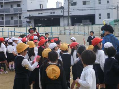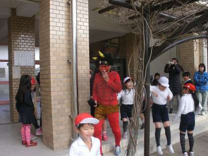 東中浜小学校の風物詩、節分の赤鬼さん青鬼さんが今年もやってきました。運動場の鬼さんの周りに子どもたちが集まりました。大人気のいい鬼さんです。