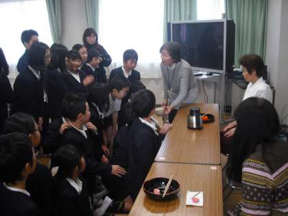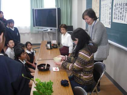 「総合的な学習の時間」の学習でお茶の先生方にお抹茶をいただきました。多目的室でお茶の歴史やお茶のたて方を学ぶのですが、緊張の面持ちで、でもうれしそうにおいしくいただきました。