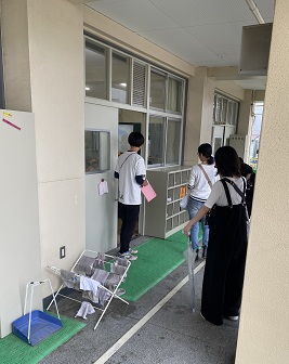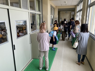 台風を想定した訓練です。暴風雨・河川の洪水の危険のため、児童だけでの下校は危険と判断し、保護者引き渡しによる緊急下校としました。