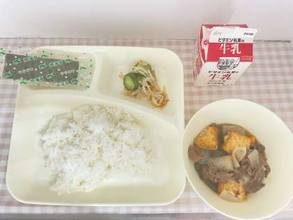 『牛肉と野菜のいため煮』は、牛肉を主材に、つなこんにゃく、あつあげ、たまねぎ、にんじん、青みにさんどまめを使用し、砂糖、みりん、塩、こいくちしょうゆで甘辛く味つけしています。