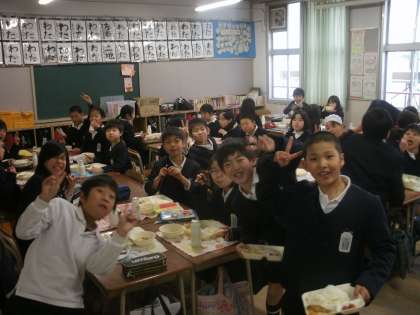 4年1組の子どもたち。楽しく食事しています。しっかり食べて、しっかり学習しましょう。