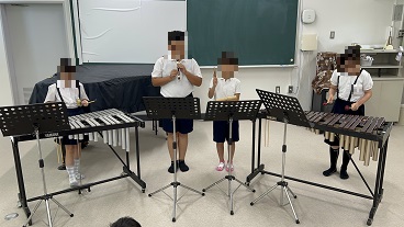 5年生が音楽の授業で、グループでの合奏にチャレンジしています。リコーダーや鉄琴、木琴、打楽器に役割分担にし、1つの曲を演奏します。