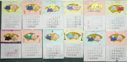 きぼう学級の3月のカレンダー。ひとりひとりがカレンダーの絵にひな人形をデザインしました。おひなさまの表情が豊かで、ぱっと春の光がてらすようです。