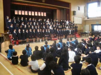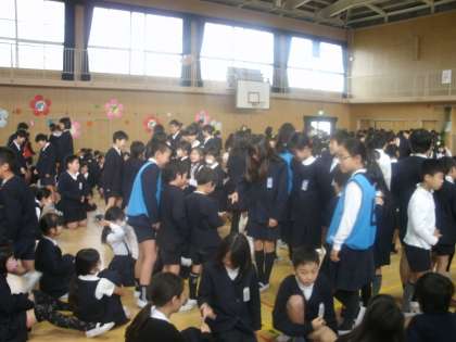 児童会主催の「卒業を祝う会」を1時間目にしました。1年生から5年生の子どもたちが「ありがとう」と「卒業おめでとう」を心を込めて伝えます。ひなだんに並んだ6年生と向き合っています。