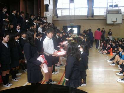 6年生から合奏・合唱と縫った新しいぞうきんの贈り物です。