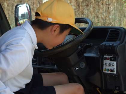1時間目はパッカー車体験です。ゴミを入れる作業が非常に危険なため、パッカー車には緊急停止用のスイッチが3つあるとの話を聞いてから体験しました。ゴミを入れるとプレスして圧縮してゴミのかさを小さくします。この仕組みがあるから一度にたくさんのゴミを回収できるとのことです。次はパッカー車の乗車体験です。回収するものにより流れる音楽が違うこと、ハンドルの右側にスイッチがあることを教えていただきました。