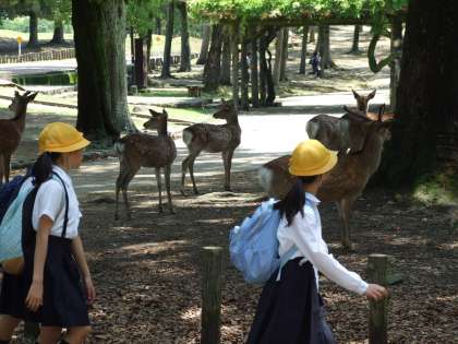 東大寺大仏殿の拝観の後、二月堂を回りました。二月堂は春の訪れを告げるお水取りをすることで有名です。そして楽しみのお弁当の時間です。奈良公園で大仏殿や若草山をバックにして食べるお弁当は格別でした。そして奈良と言えば鹿です。興福寺の近くで鹿にタッチをして近鉄奈良駅に向かいました。