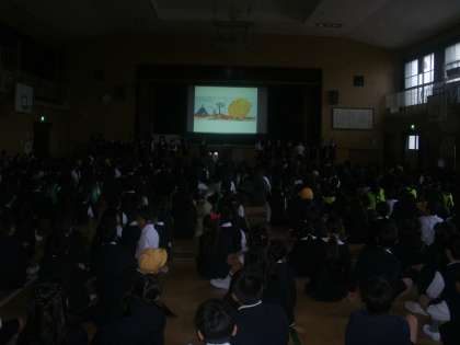 今週は読書週間です。今日の朝の児童集会では、児童会図書委員会が発表しました。スクリーンを使って絵本の「とこやにいったライオン」(サトシンさん:作 おくはらゆめさん:絵)を紙芝居にして見せたのですが、とっても楽しくできました。
