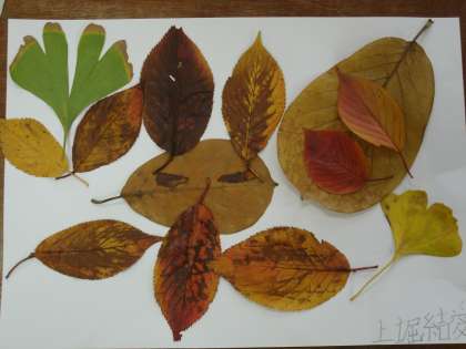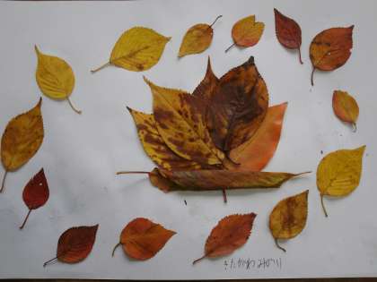 1年生の学習。ひらいあつめた落ち葉で絵をつくりました。とてもかわいく、おもしろいアイデアいっぱいです。