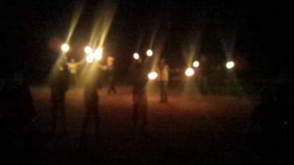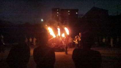 夜のプログラムのキャンプファイアー。点火の時は全員が一つとなりました。(写真 上・中)先生たちも盛り上げるために、ファイアーダンスをしました。(写真 下)全員ノリノリでした。夜は天気が回復して星がきれいでした。