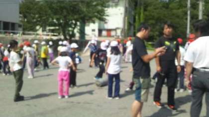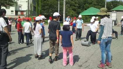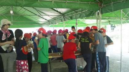 班で協力して足を使って容器を転がし、アイスを作ります。出来上がったアイスは仲良く分けて食べました。