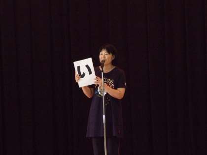 元気よい校歌に続き、校長先生からの話です。話の最後に、全校児童で高田敏子さんの「わすれもの」という詩の朗読をしました。この詩は夏休みの思い出を大切にして、清新な気持ちで2学期を迎えようとする気持ちを表現した内容です。1年、2年の低学年児童にとっては少し難しかったと思いますが、全校児童が気持ちを一つにして取り組むことができました。