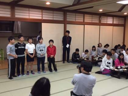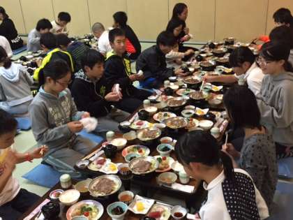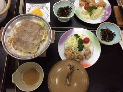 お風呂の後、待ちに待った夕御飯!豚肉の陶板焼、から揚げ、刺身に茶碗蒸しもあります。