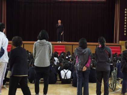 12月22日、2学期最後の日を迎えました。講堂に全校児童が集まり終業式を行いました。1年・3年・5年の児童代表から2学期の思い出についての作文発表がありました。鶴見緑地でどんぐりをいっぱい拾ったこと、友だちに励まされ逆上がりができたこと、足の痛さをこらえながら運動会のダンス練習をやりとげたことなど、2学期で頑張ったことや考えたことを発表してくれました。校長先生から一人一人が頑張ったこと、新しい年を迎えるにあたって自分の目標をたてようとの話がありました。生活指導の角尾先生からお手伝いをしよう、身の回りの整理をしよう、優しくしよう、元気よく過ごそうなど冬休みの生活で守ってほしいことの話がありました。