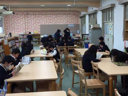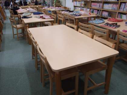 今日は雨、残念ながら運動場で遊ぶことができません。このような日は図書館が賑わいます。図書館には新しい机と椅子が入りました。子どもたちは友だちと一緒に本を読んだり一人で調べものをしたり楽しい時間を過ごしています。図書委員会の人がパソコンを使って本の貸し出しの整理をしています。