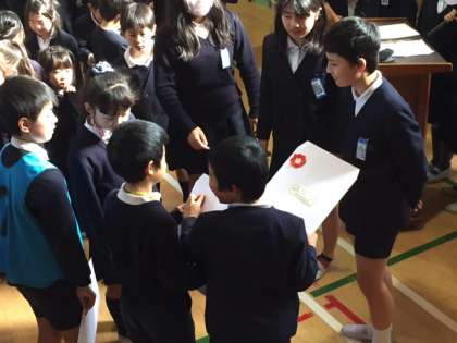 3月4日、今日は今年度最後の土曜授業。1時間目は全校児童で卒業を祝う会を行いました。まずはにこにこ班でじゃんけんリレーです。6年生との最後の交流となりました。在校生から6年生全員ににこにこ班で作った色紙のプレゼント。6年生からは美しい歌声と雑巾のプレゼントがありました。