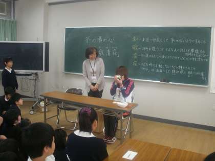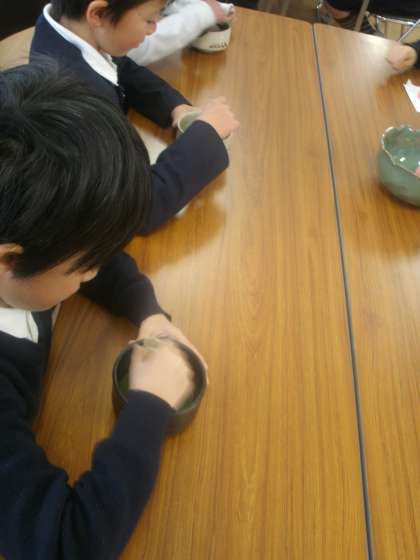 5年生は、総合的な学習の時間に「お茶の学習」をしました。お茶の先生に、お茶の心や作法を教えていただきました。茶筅(ちゃせん)でお茶をたてること、お茶のいただき方などを学びました。日本の文化を学ぶ学習です。