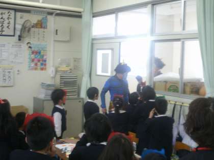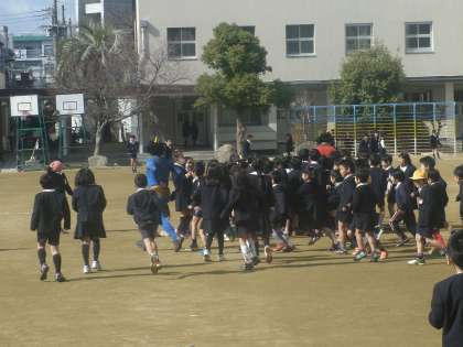 節分の鬼が2日遅れですがやってきました。赤鬼さんと青鬼さん。心やさしいおにさんなので、毎年子どもたちに大人気。運動場を追いかけ回した子どもたちは、おにさんを困らせていましたよ。
