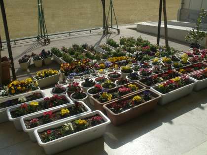 玄関を入ったところ、プランターにパンジーやジュリアンが植えられています。管理作業員さんが丹精して育てています。