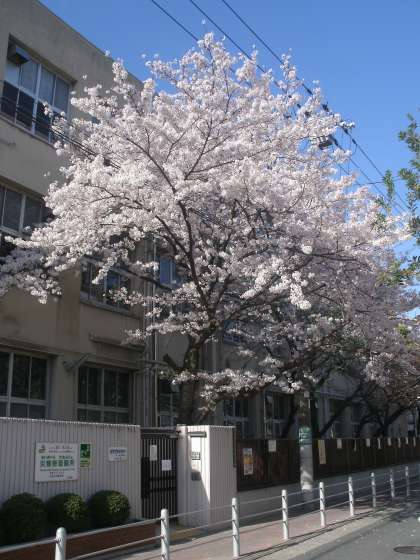 学校の桜が今年も豊かに咲きました。これから1か月、様々な種類の桜が次々と咲きほころびます。前の東中浜公園の桜も満開です。新年度を祝ってくれているようです。