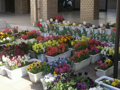 7日(月)は入学式です。今日はその準備の日です。玄関、式場の体育館、そして1年生の教室をあたたかく飾りつけました。新2年生はお祝いの演技の練習をしました。玄関を入ったところには、プランターの花がいっぱい並んでいます。