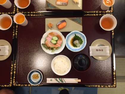 朝食のメニューは鮭にハムとサラダ、そしてイカソーメンがついていました。今日一日の元気の活力をしっかり食べて、2日目の活動がスタートです。