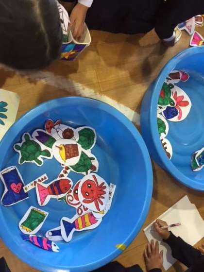 今日は1年と2年が一緒になって、講堂でおもちゃ大会をしました。この取り組みは生活科の学習です。2年の子どもたちが作ったおもちゃやゲームを1年の子どもたちと一緒になって遊んでいきます。2年の子どもたちはこの日を目標にしておもちゃ作りや説明の練習に頑張りました。楽しい時間になりました。