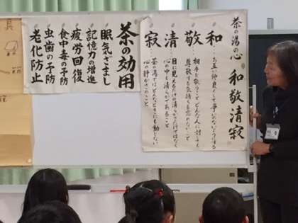 今日はお茶会です。5年生の児童が講師の方々からお抹茶のたてかた、和菓子の食べ方など、作法を教えていただきました。子どもたちはお茶をたて和菓子をいただきながら、日本の文化に触れることができました。