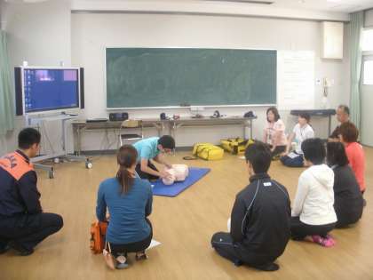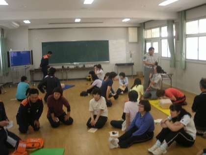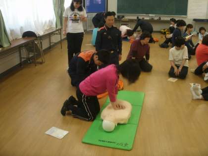 5月28日、教職員の救急救命法講習会を行いました。城東消防署の救急隊員の方たちの指導で蘇生法やAEDの使用法を学びました。毎年行っていますが、変更されたところもあり、真剣な表情で取り組んでいました。