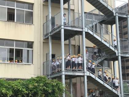 火災を想定した避難訓練を行ないました。その後、3・6年生は、講堂で「煙中体験」をしました。