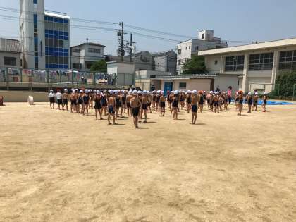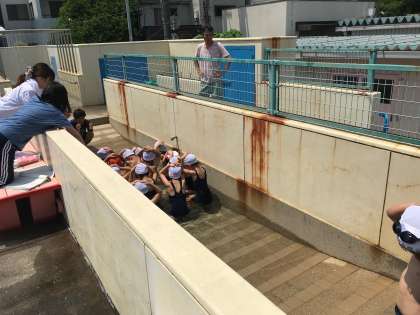 今日から、プール水泳が始まりました。子どもたちは、楽しそうに水に慣れる動きを一生懸命頑張っていました。その後、地震時の避難訓練をしました。