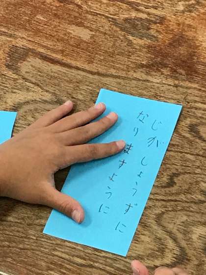 七夕に向け、自分の好きな色の折り紙に各自の願いごとを書きました。