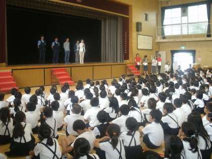 今回の避難訓練は、不審者侵入による防犯訓練です。城東警察の警察官の方たちに指導していただきました。生命を守るためにしっかり行動できるよう、学校外での危険にも対応できるお話をしていただきました。