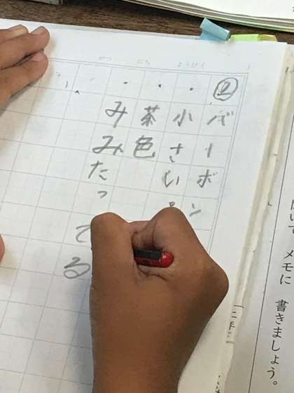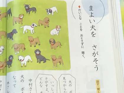 先生が犬の特徴を話され、メモをとりその内容から教科書にいる犬を見つける学習をしました。