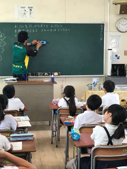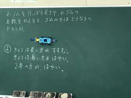 輪ゴムの長さや本数を変えるとどうなるかを考えました。