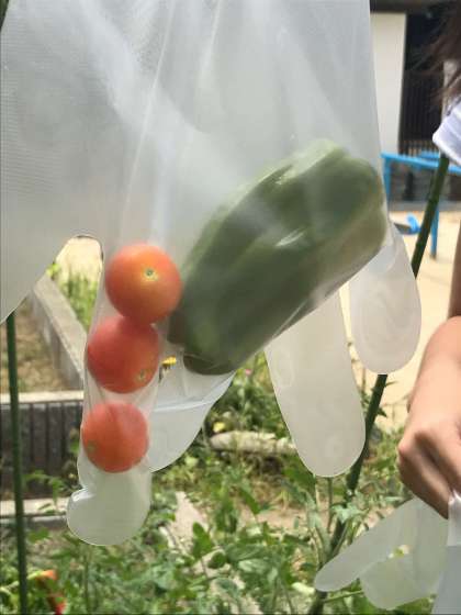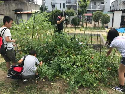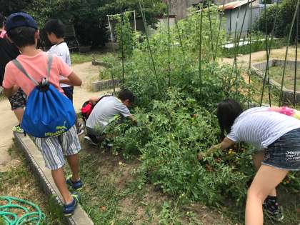 暑い中、栽培委員会の子どもたちが水やりと収穫をがんばってました。