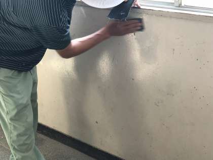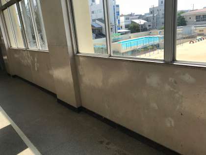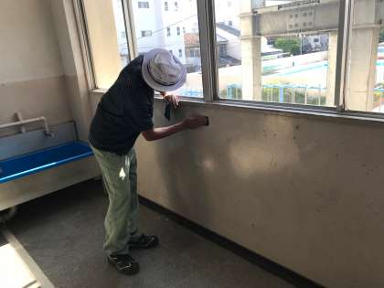 夏休みを利用して、管理作業員さんによる校内環境整備作業を行っていただいています。先ずは、廊下の壁を塗り替える作業から始めていただきました。ペンキを塗る前にペーパーがけをし、下地を整えました。