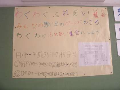 児童会のポスターです。保護者のみなさん、1年から6年の子どもたちが集まる「にこにこ班」ごとにゲームコーナーを作り、全校あげて楽しむ活動です。みんなが力を合わせて活動する姿をごらんください。
