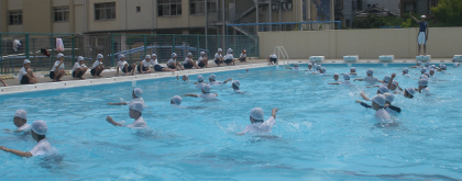 全学年で着衣泳の学習をしました。服を着て水に入ることで、水の事故の怖さを体験させることを知らせる、命を守る学習です。