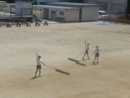 今日まで期末個人懇談会のため、午前中授業です。下校前に、児童会の運動委員会の子どもたちが、いつものように運動場にコートブラシをかけていました。「今日、つかった運動場、明日も気持ちよく使えるように。そして、運動場ありがとう」という気持ちを込めて整備するのです。