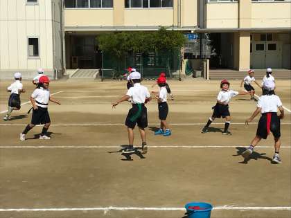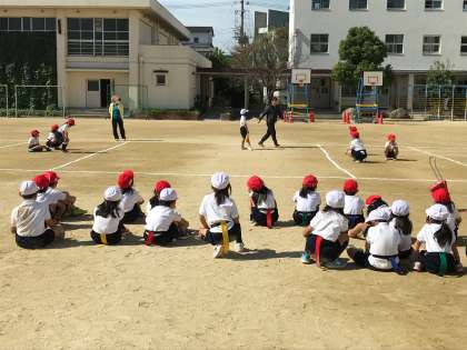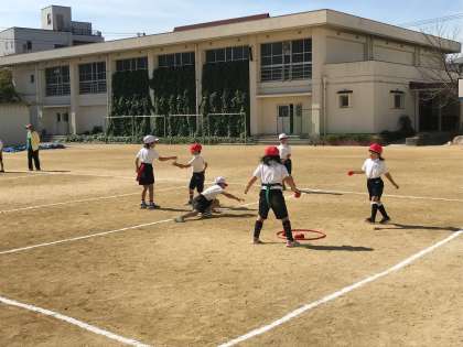 守備側を通り抜けて、赤玉を所定のフラフープの中に幾つ入れられるかを競うゲームをしました。