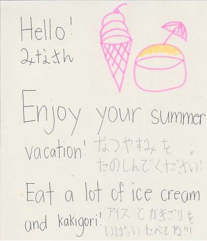 Hello!Enjoy your summer vacation!Eat a lot of ice cream and kakigori!(みなさん!なつやすみをたのしんでください!アイスとかき氷をいっぱい食べてね!!!)